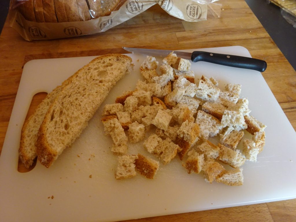 Uma vez tostado o pão, coloque-o na tigela com os vegetais.