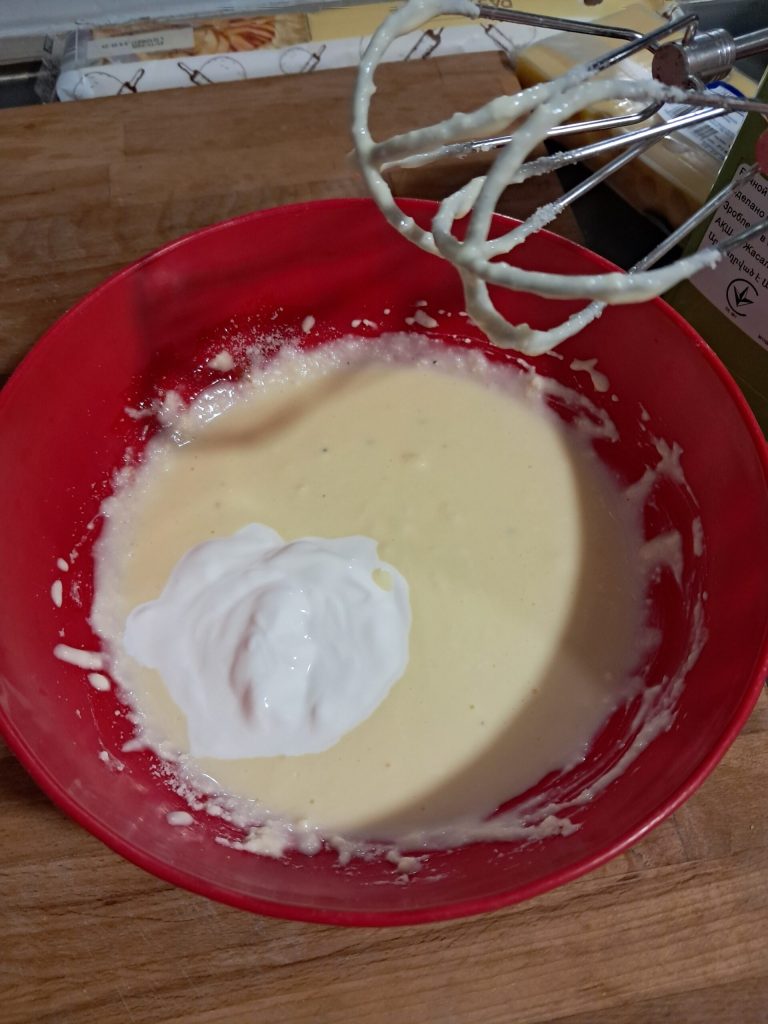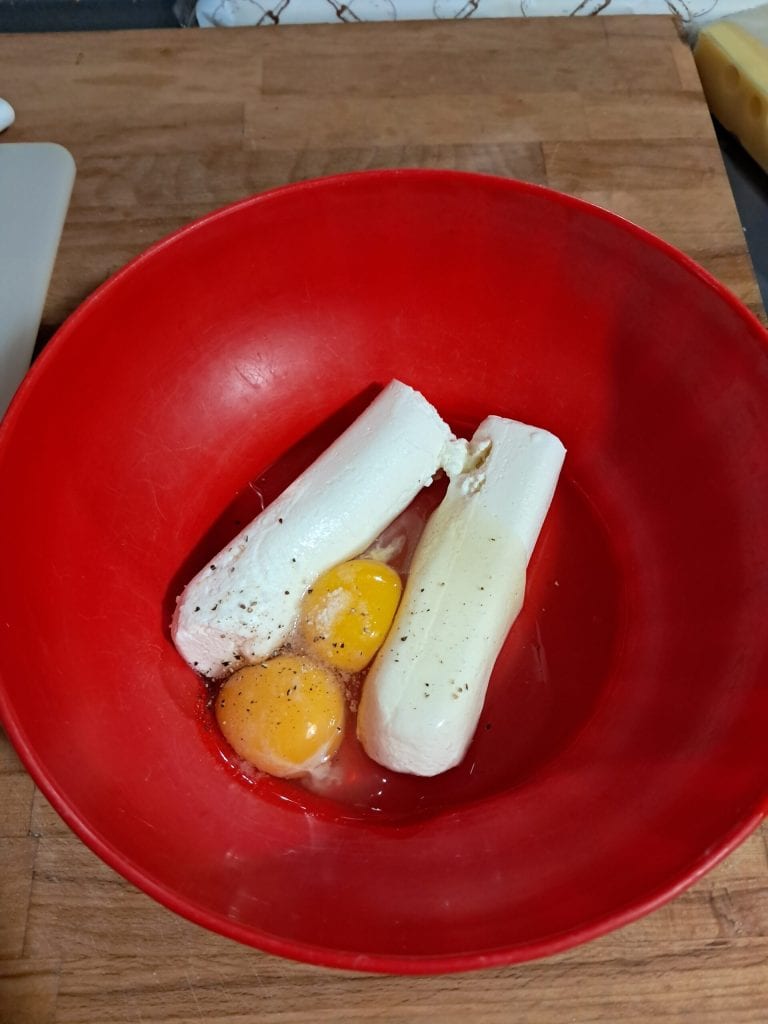 Enquanto isso, bata o queijo de cabra com 2 ovos e uma generosa pitada de pimenta do reino fresca com um batedor elétrico.