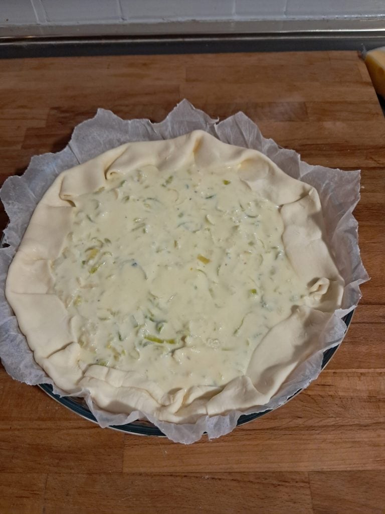 Desenrole agora a massa brisée sobre uma assadeira redonda e despeje o creme com o alho-poró.