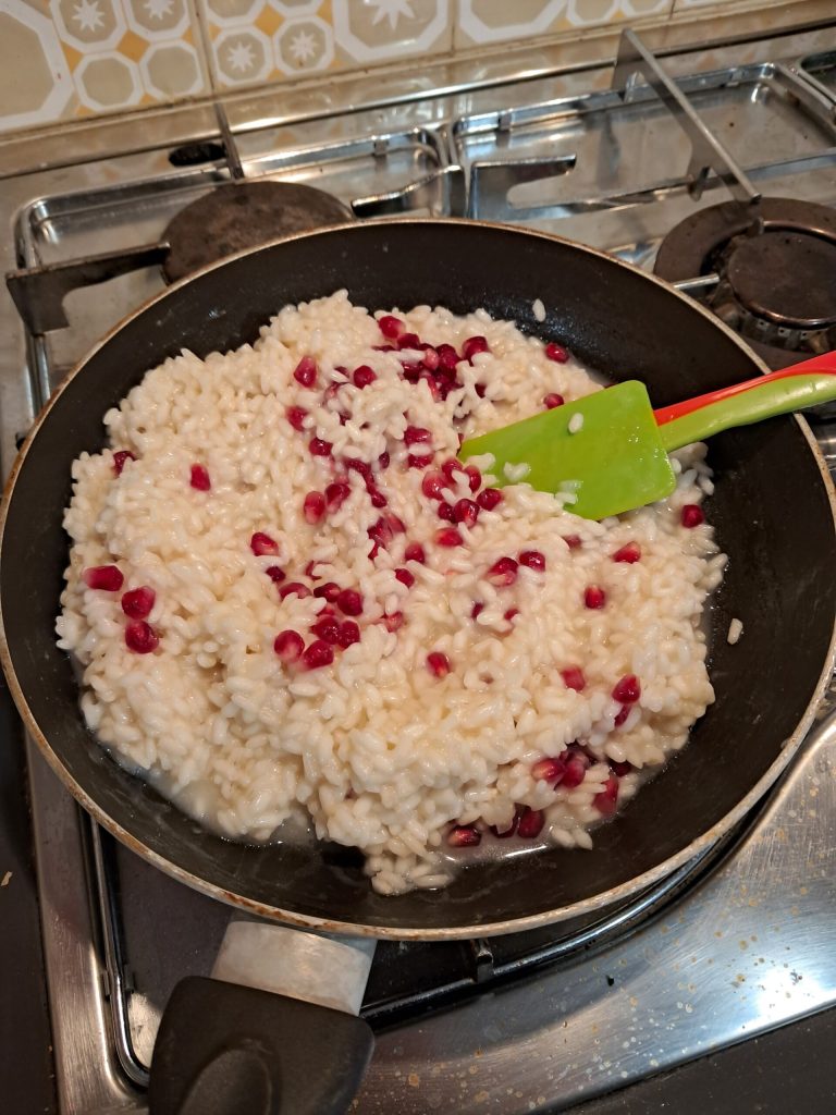 Se você não quiser adicionar as sementes de romã dentro do risoto, sempre pode servir o arroz “branco” com uma decoração de romã e levar as sementes restantes em uma tigela, para que cada pessoa coloque a quantidade desejada.