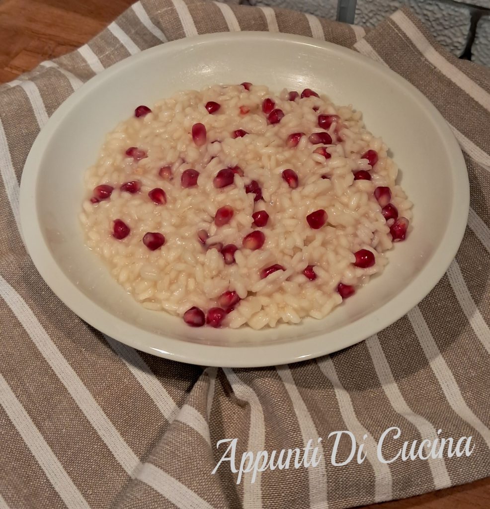 Risoto de moscato e romã, um risoto cremoso com sabor delicado mas ao mesmo tempo levemente picante. Preparado com moscato e finalizado no fim do cozimento com manteiga e queijo, aos quais são adicionadas as sementes de romã.