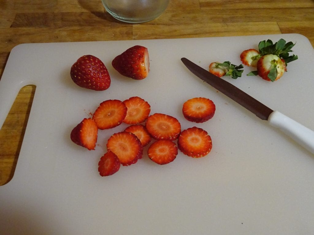• Limpe e lave os morangos, depois corte-os em fatias de cerca de 3/4 milímetros de espessura e coloque-os aleatoriamente sobre a cama de rúcula.