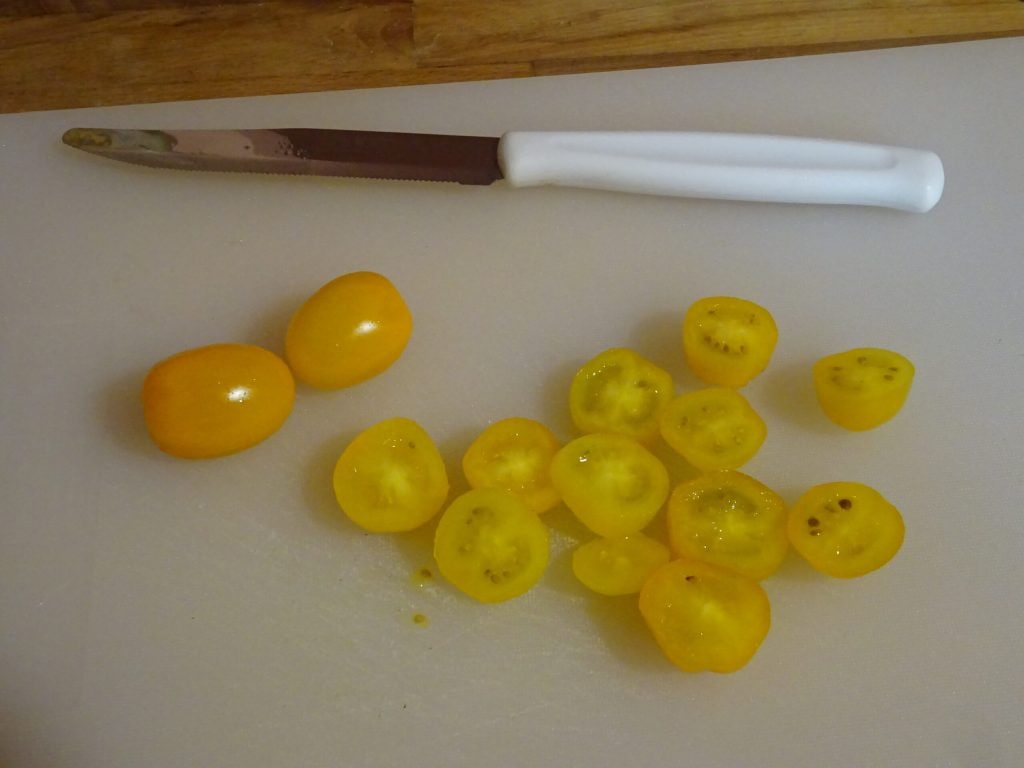 Lave também os tomatinhos amarelos e depois corte-os em rodelas de cerca de meio centímetro.