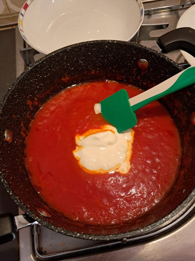 Após os 10 minutos de cozimento do tomate, adicione o creme de leite e misture até que tudo esteja bem incorporado.