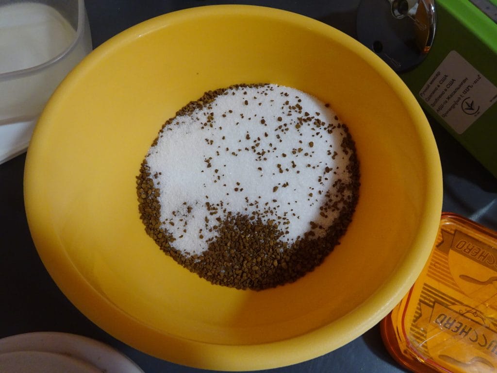 Despeje em uma tigela, de preferência de aço e ampla, o café solúvel e o açúcar refinado.