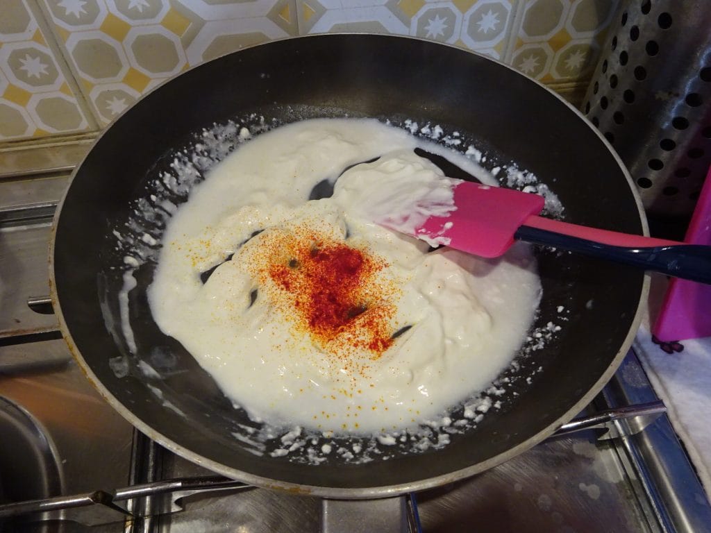 Quando a robiola estiver bem derretida, retire a frigideira do fogo e adicione o pacotinho de açafrão.