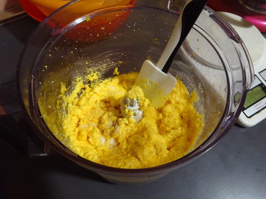 • Primeiro, retire a massa brisé das embalagens plásticas e deixe de lado. Coloque a abóbora cortada em pedaços grandes no copo do processador e triture até quase virar pó.