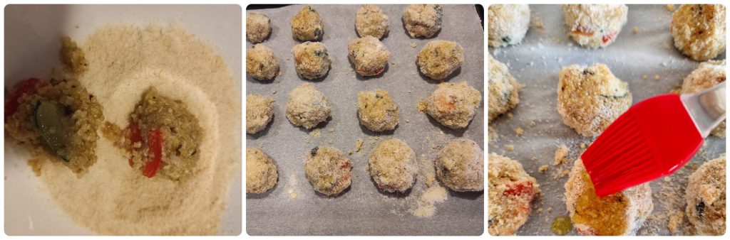Em uma tigela grande, misture a quinoa fria, os legumes refogados, o ovo e o parmesão. Misture bem até obter uma massa homogênea. Com as mãos umedecidas, modele bolinhas de cerca de 4 cm de diâmetro. Passe-as, uma a uma, no pão ralado, pressionando levemente para a empanagem aderir.