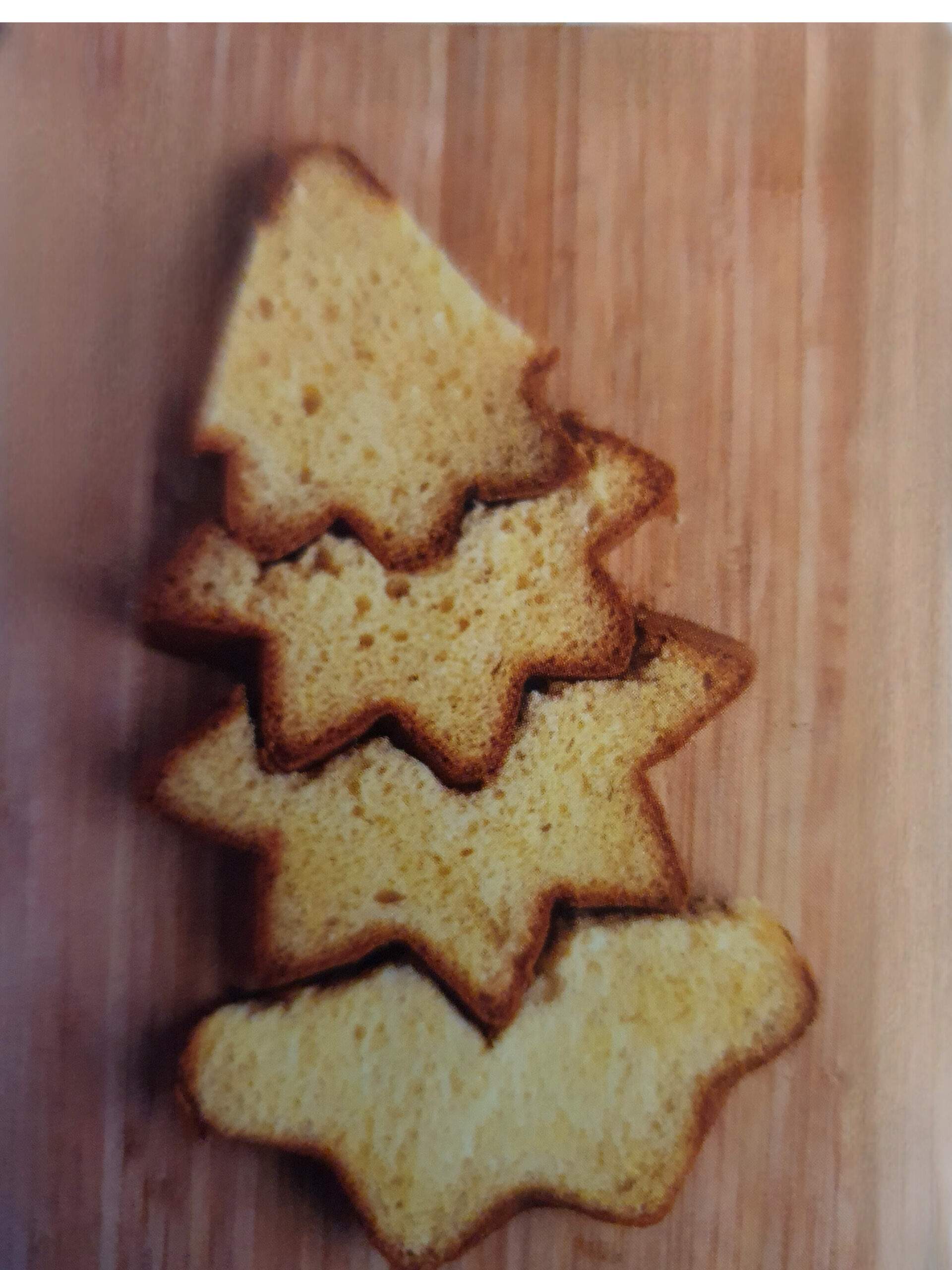 • Colocar 3-4 fatias sobre uma superfície de trabalho e definir a forma da árvore de Natal também moldando e cortando alguns pedaços de pandoro.