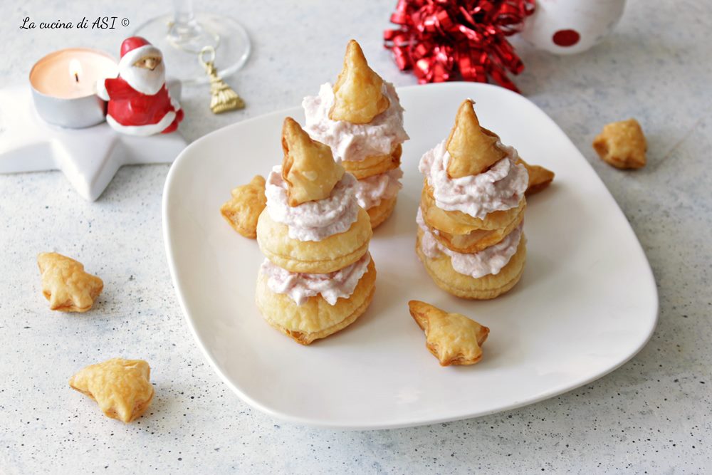 • Preparo as árvores de massa folhada perfeitas como entrada de Natal colocando o círculo maior embaixo, recheando com um pouco de mousse salgada e cobrindo com o círculo menor.