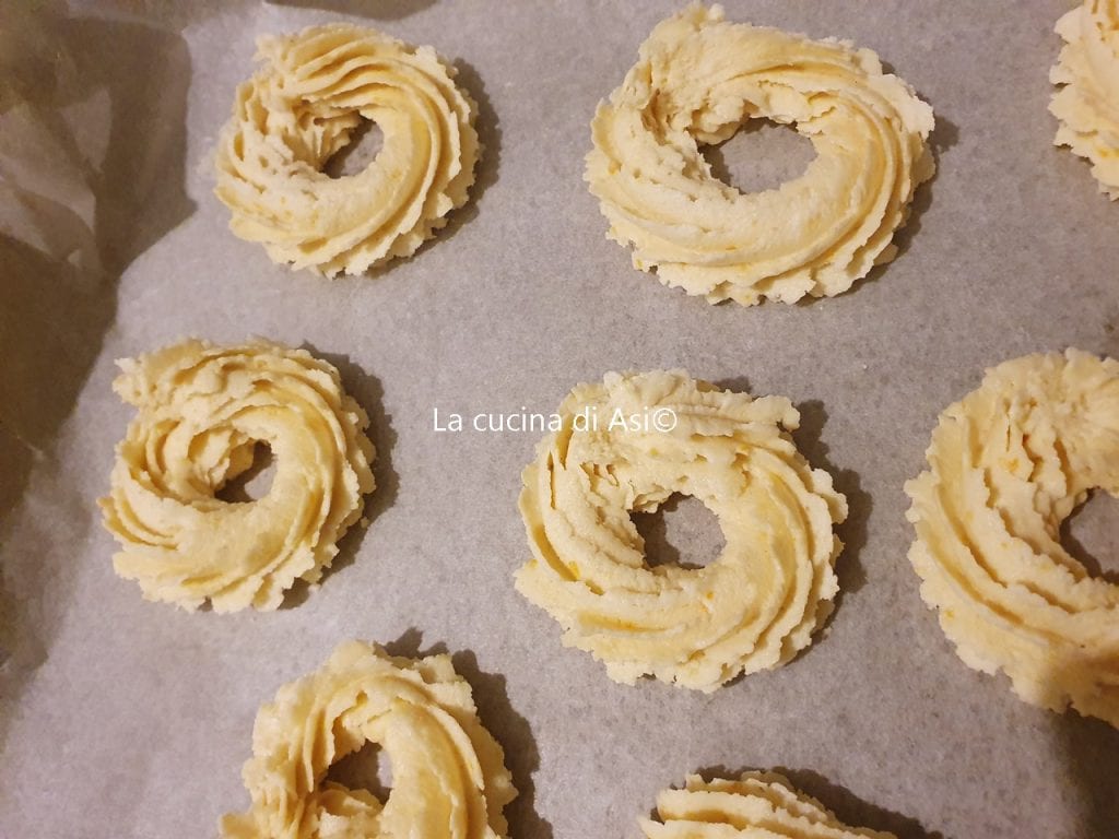 Neste ponto, eu cometi um erro… coloquei imediatamente a mistura no saco de confeitar, forrei a assadeira com papel manteiga e fiz biscoitinhos em formato de rosca com sabor de laranja IMEDIATAMENTE e assei IMEDIATAMENTE a 170°C por cerca de 10/12 minutos em modo estático.