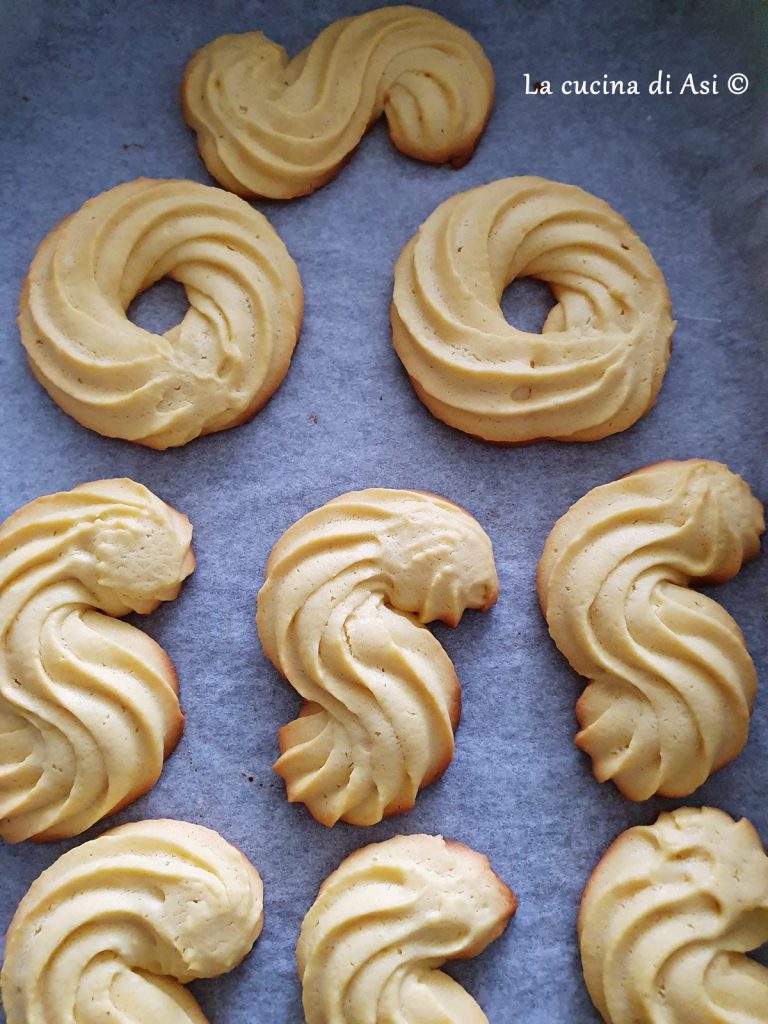 5) Pego o saco de confeitar descartável, coloco a mistura e começo a fazer biscoitos de massa montada usando um bico serrilhado de cerca de 1 cm e os formo diretamente sobre a assadeira forrada com papel manteiga.