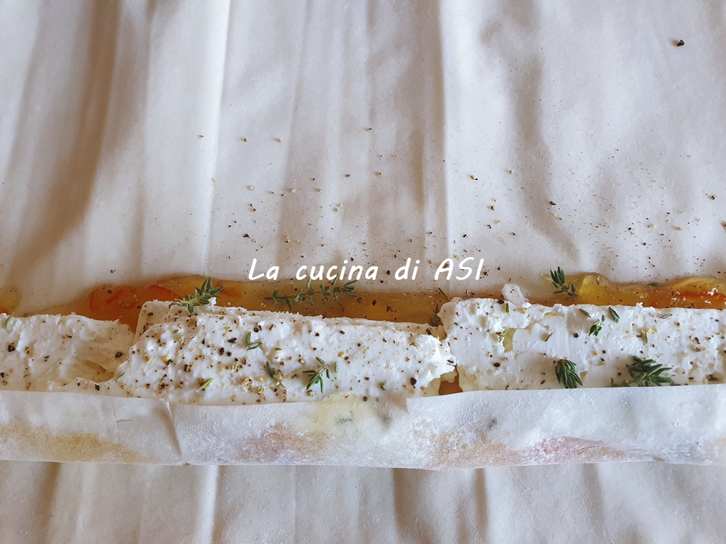 Passe a geleia escolhida (para mim, laranja) fazendo uma faixa a 3/4 cm da borda.Corte o feta transversalmente em 4 pedaços iguais.
