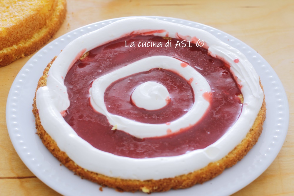 4) continuo sobrepondo a segunda camada de pão de ló e refazendo as espirais de maravilhoso creme branco delicado e do purê de frutas vermelhas
