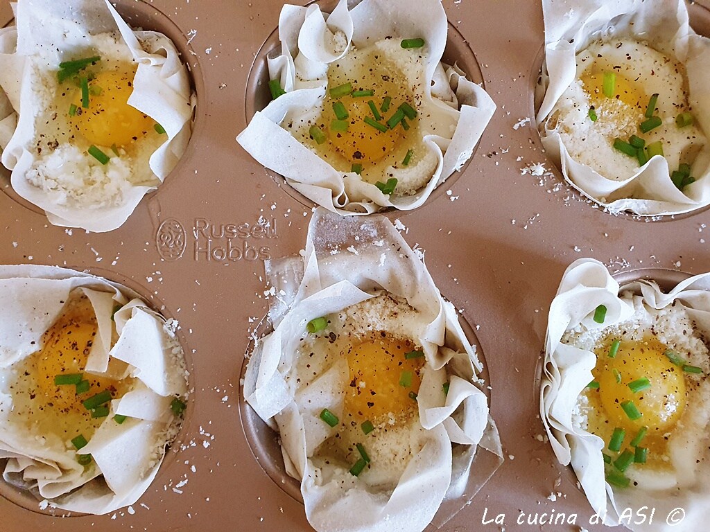Agora salgo e pimento cada pequeno cestinho recheado de massa filo e adiciono Grana Padano ralado e, por último, alguns talos de cebolinha lavada e cortada grosseiramente.