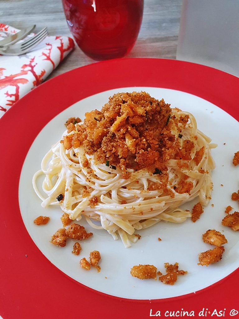 Componho os pratos com as linguine cremosas adicionando a gosto o crumble de salmão e pão e uma abundante picada de cebolinha fresca e raspas de limão bio.