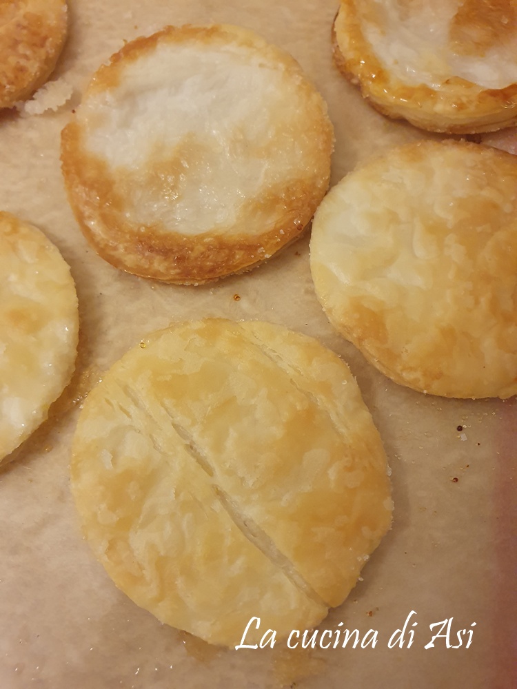 Asse em forno estático a 190–200°C por cerca de 15–20 minutos, verificando o cozimento até obter uma folhada dourada e seca.