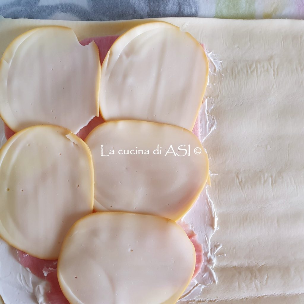 Escolhi o recheio com base no que encontrei na geladeira, ou seja, queijo cremoso, fatias de presunto cozido cortadas de um pedaço e fatias de queijo coalho.