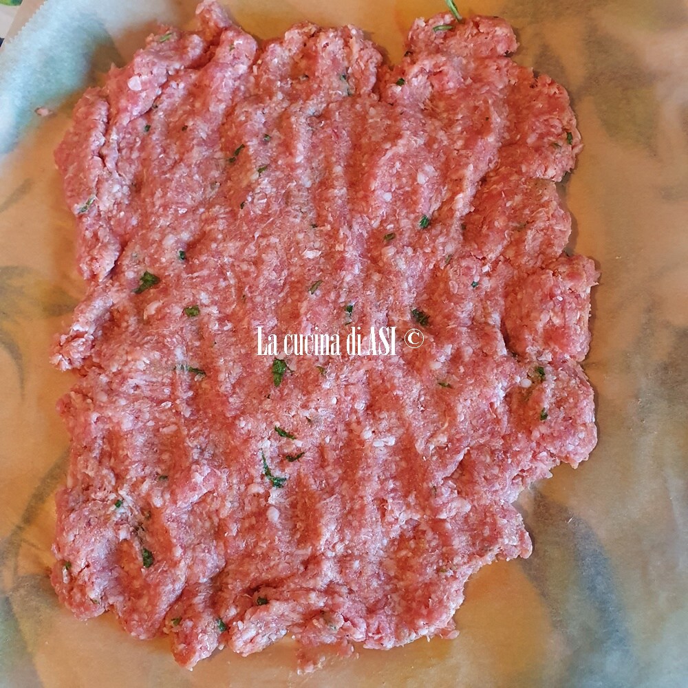 Pego uma assadeira, coloco no fundo azeite de oliva extravirgem e um copo de água (ou caldo ou vinho ou mix de tudo), coloco o rolinho de carne e levo ao forno a 200°C por cerca de 30/35 minutos, controlando e virando o rolinho de carne moída e recheada para um cozimento uniforme.