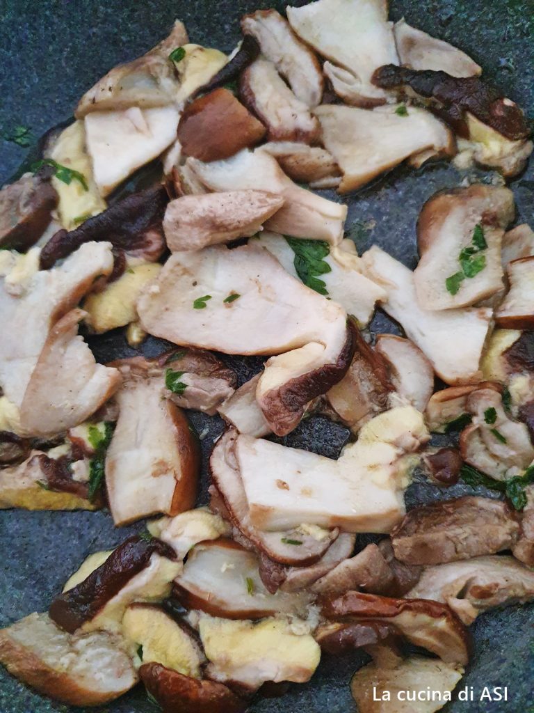 5) Em uma frigideira coloco algumas colheres de azeite extravirgem com os dentes de alho esmagados e, quando chiar, adiciono as fatias de porcini e deixo cozinhar por cerca de 10/12 minutos em fogo médio, ajustando o sal e a pimenta.
