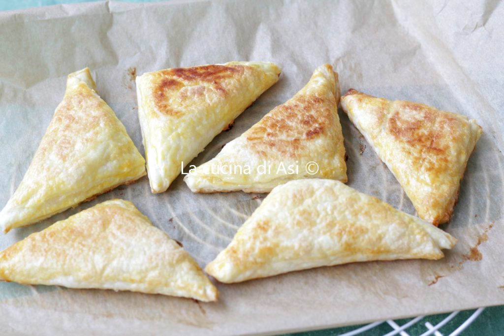 Pincele com a mistura de gema e leite restante o topo dos triângulos. Arrume os folhados na assadeira forrada com papel manteiga molhado e escorrido, asse em forno já aquecido a 180°C por cerca de 15-20 minutos e retire do forno.