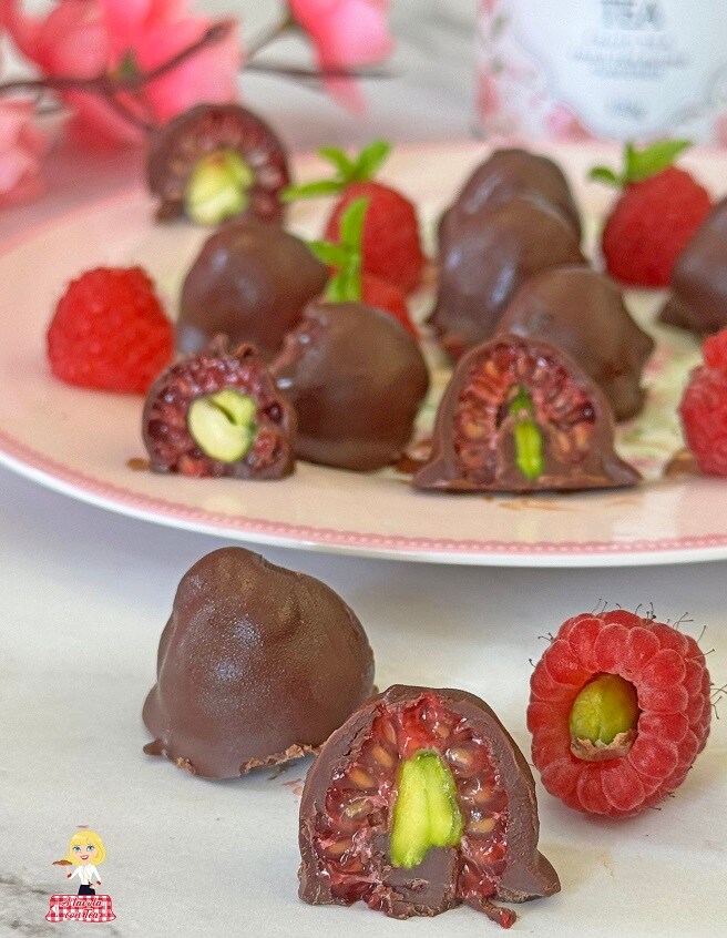 As framboesas com chocolate e recheio de pistache são uma sobremesa muito simples, super deliciosa e realmente chique para apresentar à mesa.