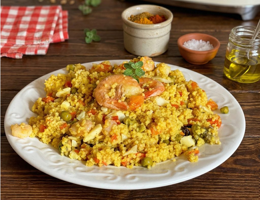 Hoje vamos preparar juntos uma receita super simples: o couscous com camarões e legumes, um prato único muito apetitoso que ficará pronto em menos tempo do que você imagina.