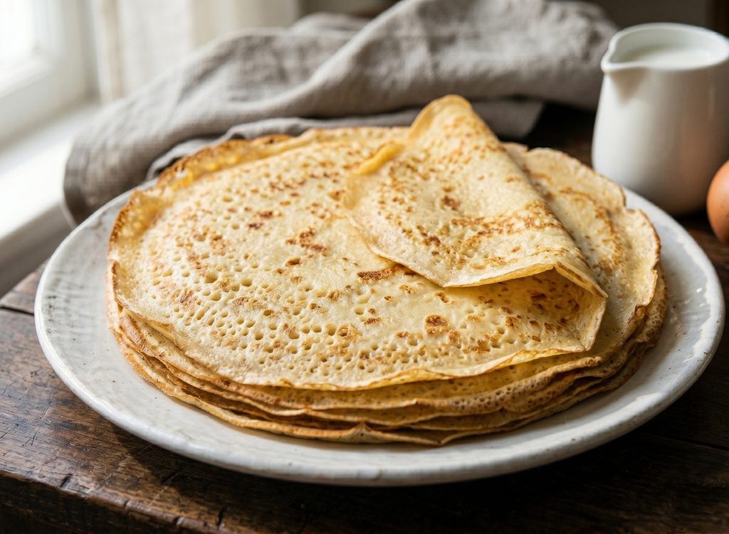 Eu calibrei esta receita base especificamente para 2 pessoas, rendendo cerca de 8 crespelles de 22 cm. Nesta versão vou mostrar como obter uma massa densa que depois fica fluida, capaz de deslizar na frigideira como seda, garantindo aquela mordida elástica e fina que é a marca registrada das crêpes francesas.