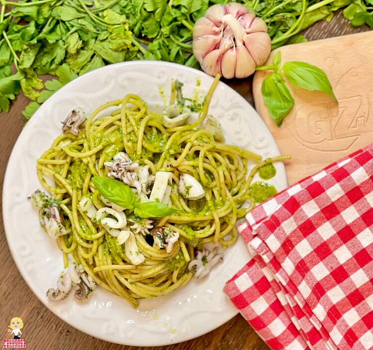 O macarrão ao pesto e lulas é um prato principal original e com uma combinação de sabores vencedora: um leve sabor do mar combinado com o pesto caseiro e seu intenso aroma de manjericão que confere cremosidade.