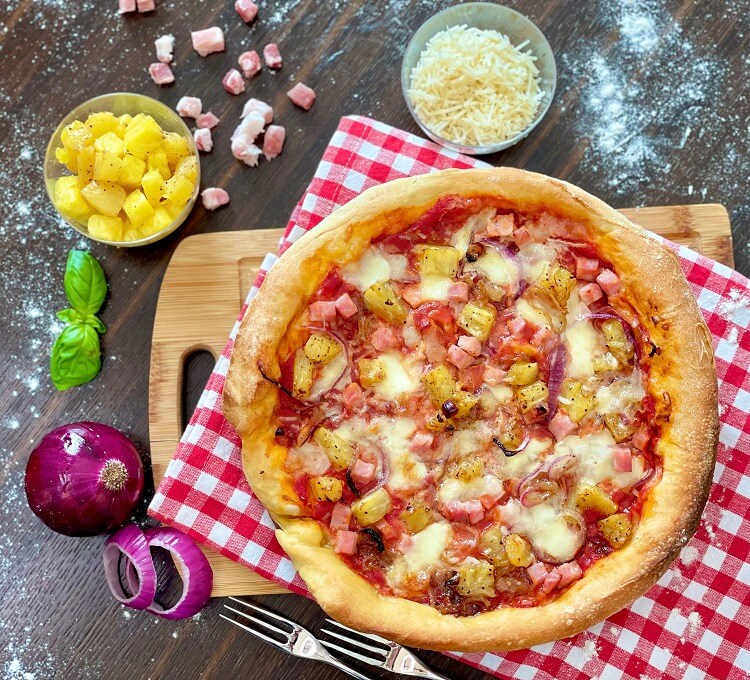 ABACAXI: Não é possível substituir o abacaxi fresco pelo enlatado porque é muito doce e macerado, o que arruinaria completamente o equilíbrio dos sabores desta pizza.