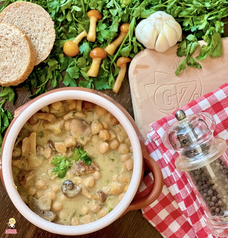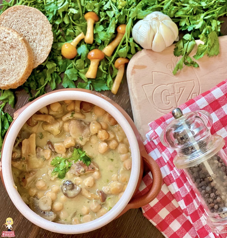 A que vamos preparar hoje é a receita clássica da sopa de grão-de-bico, do livro de receitas da minha mãe, enriquecida com cogumelos, que faço todo inverno, mas usando cogumelos congelados ou secos você pode cozinhar o ano todo.