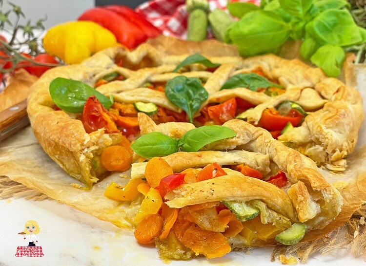 A Torta com legumes é uma torta salgada feita com massa folhada já pronta, eu escolhi a integral, e um recheio à base de pimentões, abobrinhas, cenouras e tomates, enriquecidos com queijo scamorza derretido.