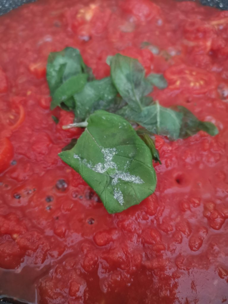 Adicione a polpa de tomate e algumas folhas de manjericão picadas.