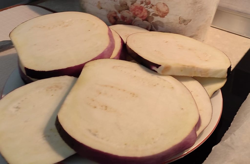 Primeiro, lavamos e cortamos as berinjelas em fatias. Certifique-se de que não sejam muito finas, com cerca de 1 cm de espessura.