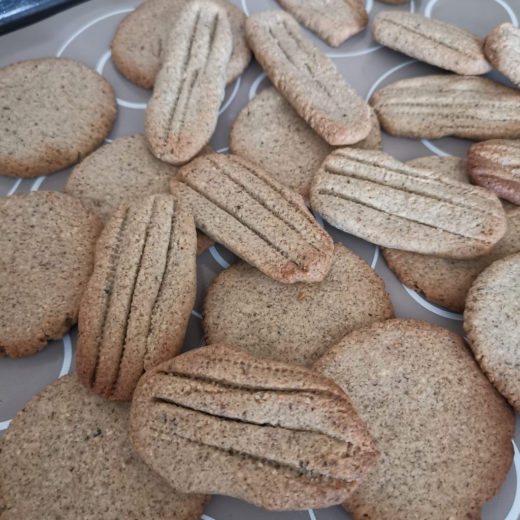 Fiz biscoitos redondos ou em forma alongada, que finalizei na superfície com cortes de faca.