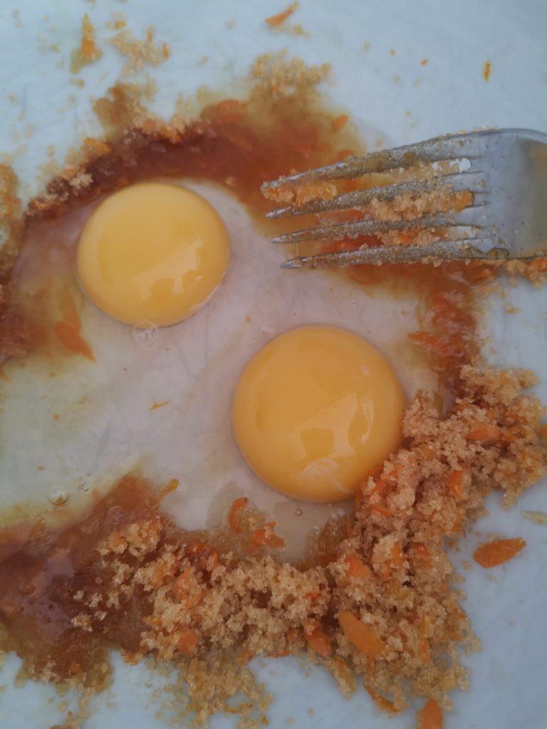 Em um recipiente, quebramos os ovos, adicionamos o açúcar e a casca ralada da laranja.