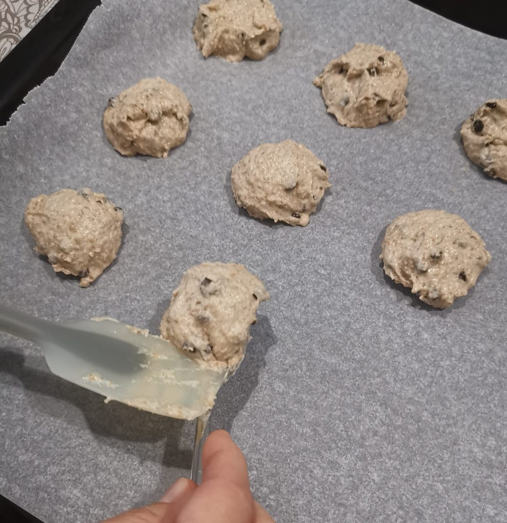 Forre a assadeira com papel manteiga e com uma colher comece a pegar a massa para colocar em cima. Para fazer a massa escorregar da colher, sempre me ajudo com uma ‘pão duro’.