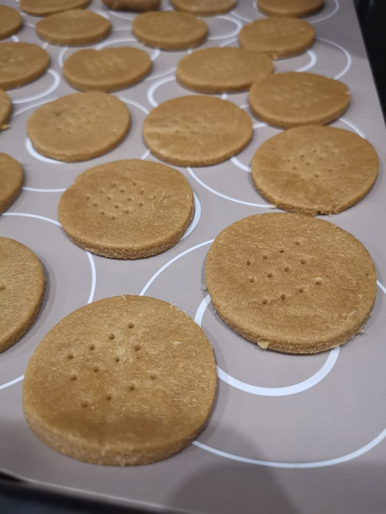 Coloque os biscoitos na assadeira forrada com papel manteiga compostável ou um tapete de silicone.