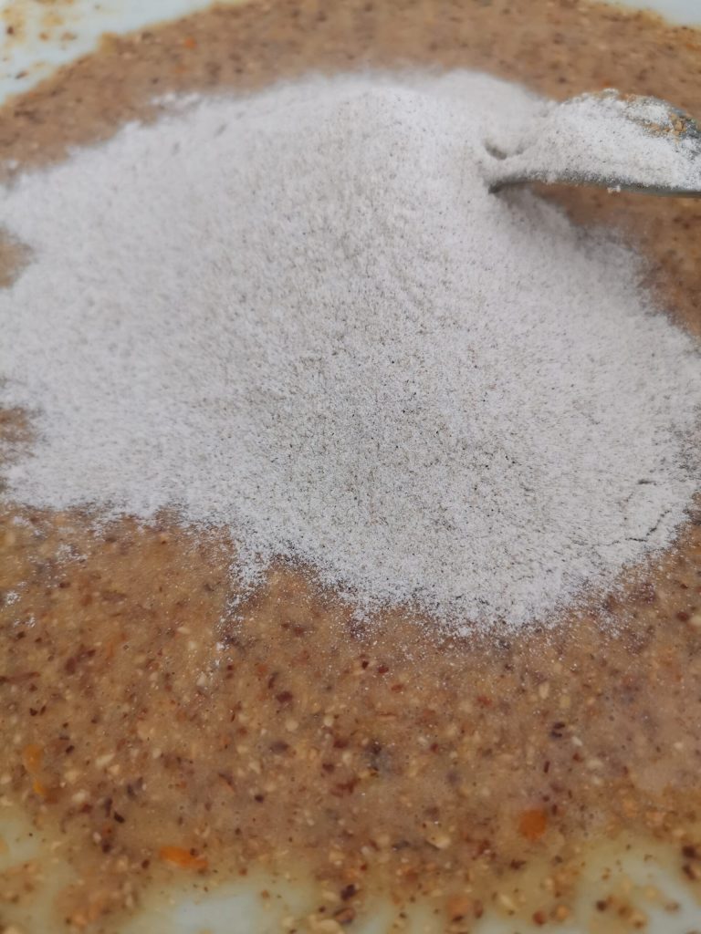 Adicione também o óleo e continue a mexer. Agora adicionamos também os pós. A farinha de arroz e depois a farinha de trigo sarraceno.