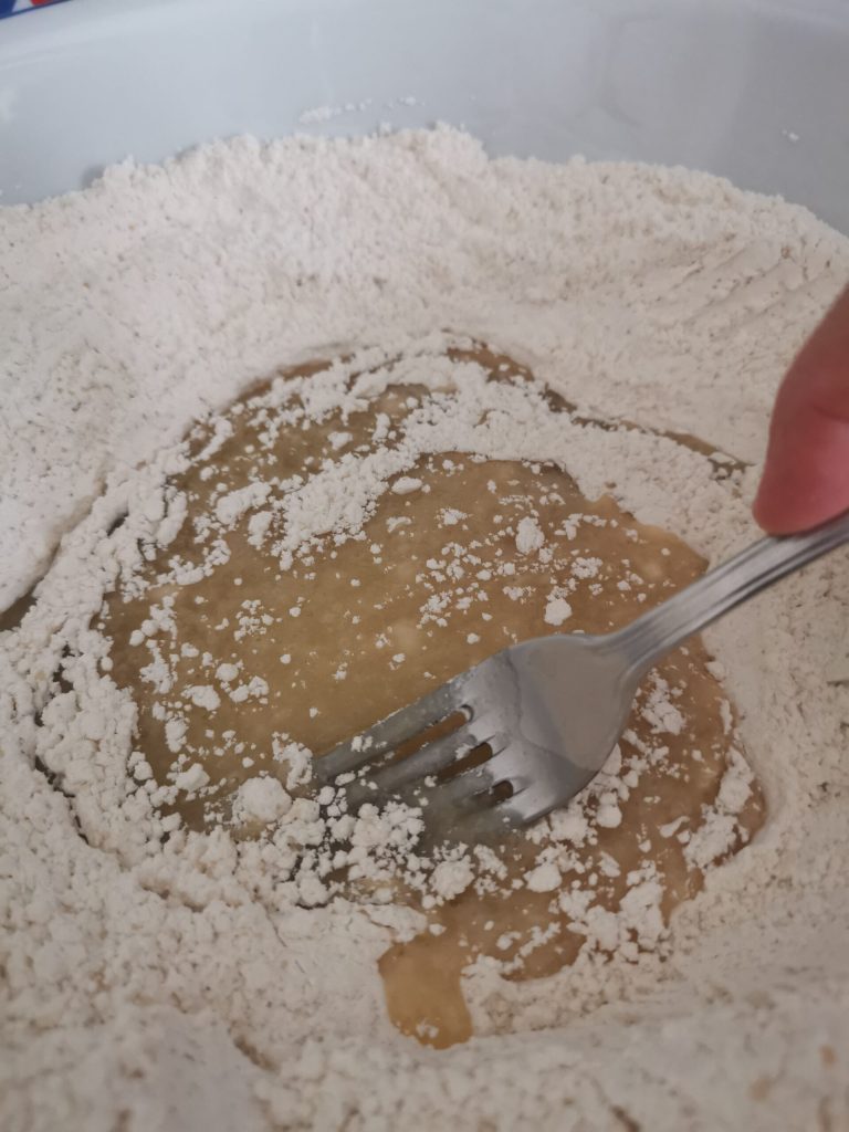 • A partir do centro, começamos a juntar a farinha das bordas e misturamos com um garfo ou, se preferir, já com as mãos. Adicionamos também as gotas de chocolate e continuamos a misturar.
