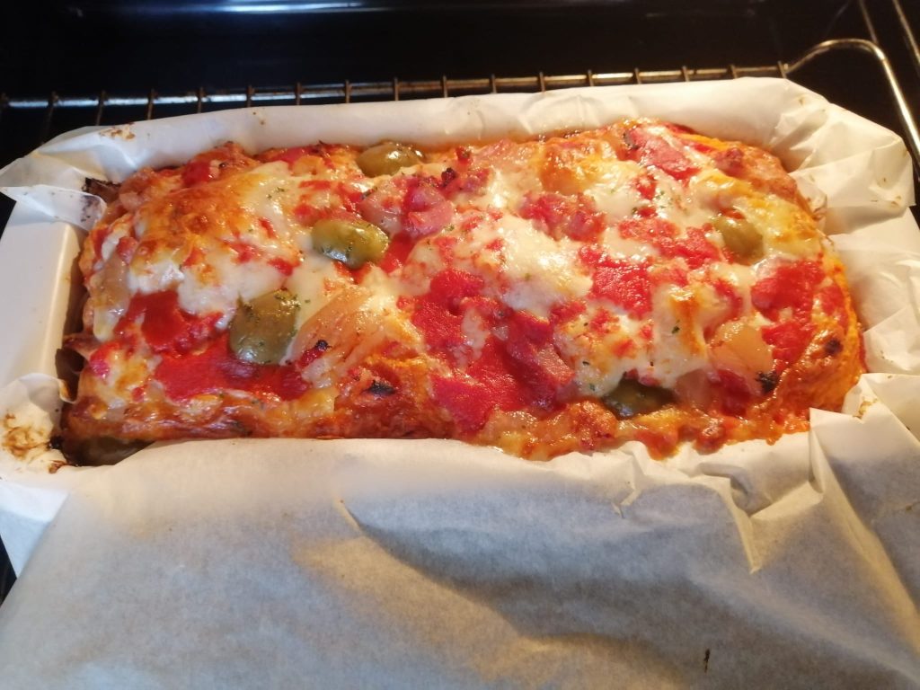 A massa deve ficar macia, mas não líquida. Algo intermediário. Agora forre uma forma com papel manteiga e despeje a massa dentro, adicionando na superfície o restante do molho de tomate, stracchino, mozzarella, azeitonas, queijo parmesão ralado e, se gostar, eu também coloquei alguns filés de berinjela em conserva.