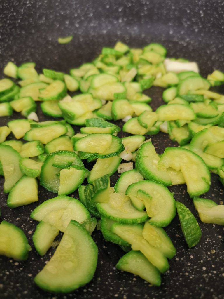 Cortamos em rodelas, também cortamos o alho e colocamos na frigideira.