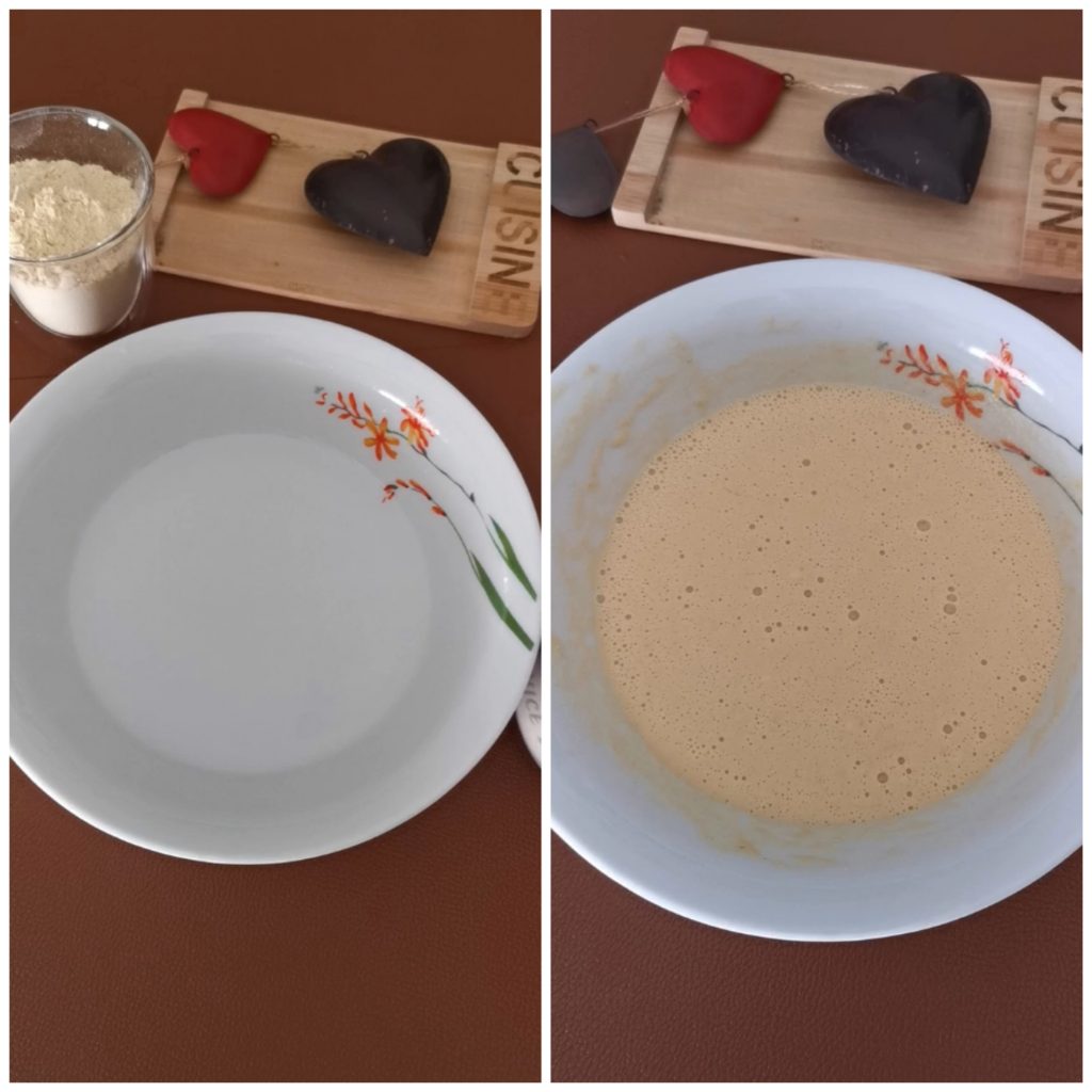 Acrescente a farinha de grão-de-bico e com um batedor manual comece a misturar os ingredientes.