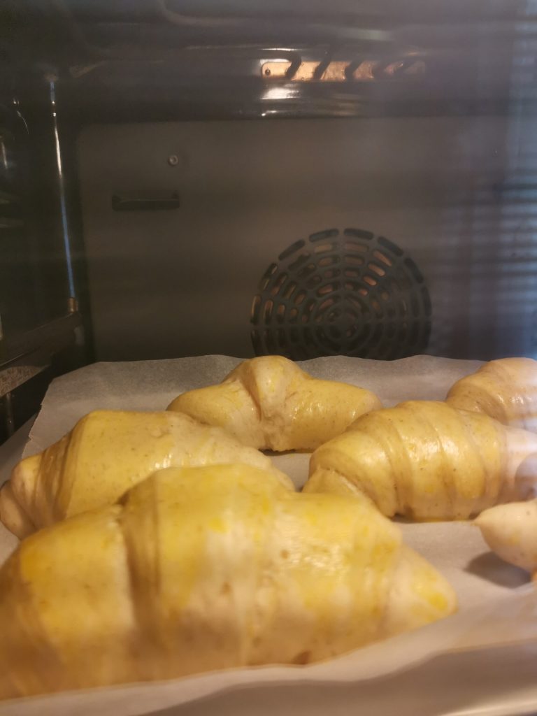Após dar forma, coloque os croissants em assadeiras cobertas com papel manteiga e deixe fermentar novamente por cerca de uma hora e meia.