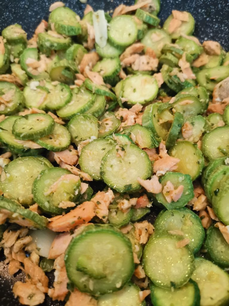 Quando a abobrinha estiver quase pronta, adicionamos na frigideira o salmão cortado em pedaços.