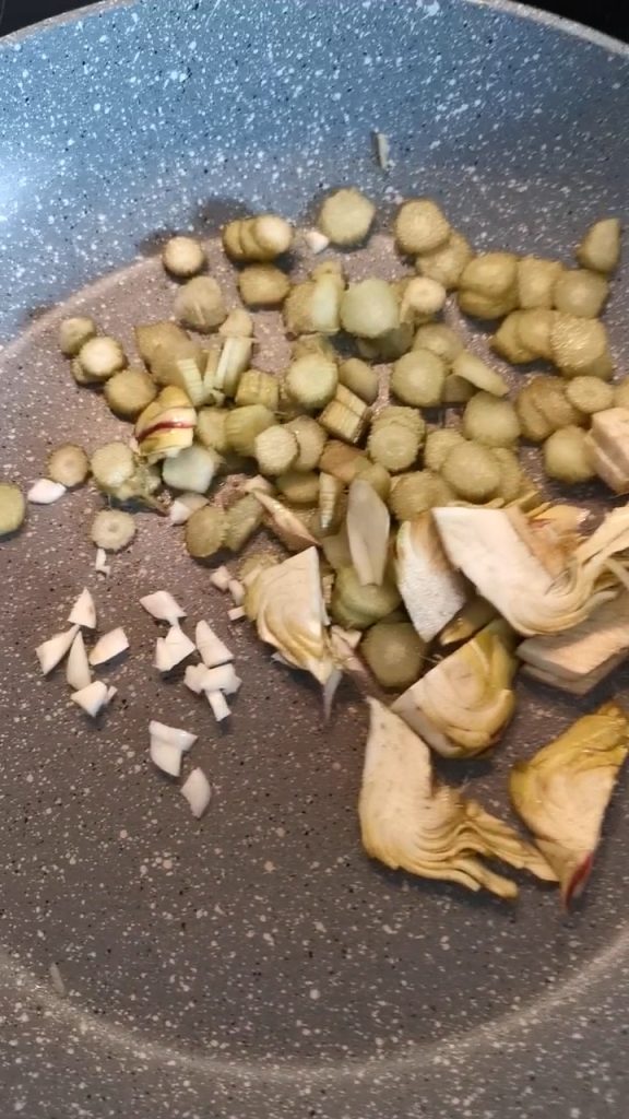 Doure as alcachofras mexendo por alguns minutos junto com os outros ingredientes, adicione também um copo de água e continue cozinhando por cerca de trinta minutos.