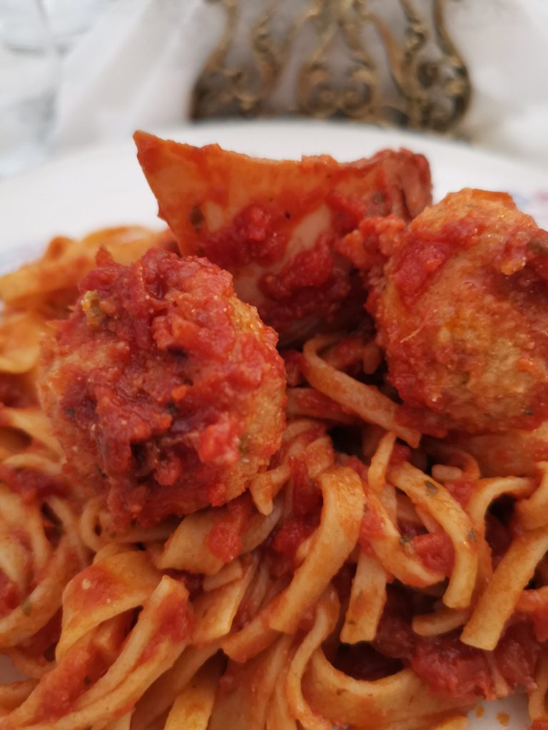 Com o recheio restante, depois de adicionar algumas colheres de sopa de farinha de rosca, preparei almôndegas que também coloquei no molho para completar o prato.