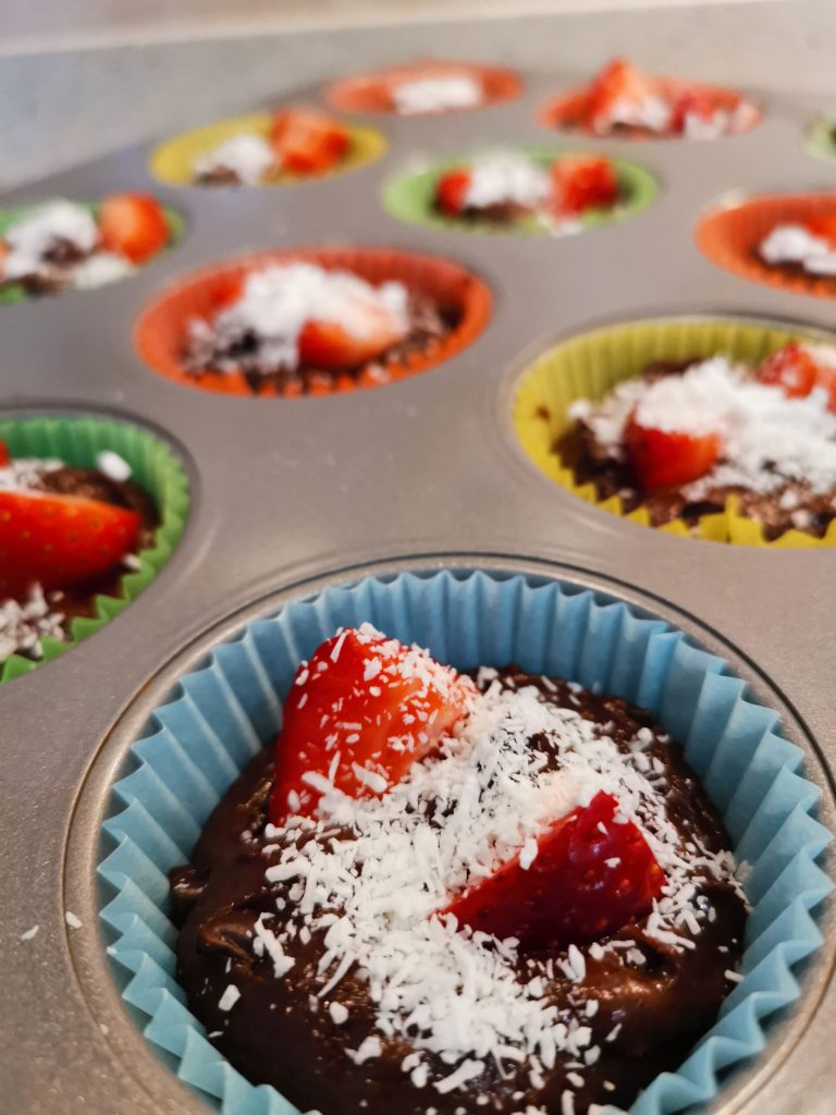 Se estivermos na época de morangos, você pode deixar seu muffin mais saboroso adicionando alguns pedaços dessa fruta. Caso contrário, eles ficam ótimos também sem. Como decoração final, coloquei açúcar granulado em alguns, e em outros, uma pitada de coco ralado. Faça de acordo com seu gosto e preferência.