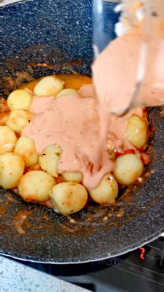 Enquanto isso, você terá cozinhado os nhoques ou, se preferir, outro tipo de massa, mesmo seca, como penne, fusilli, etc…