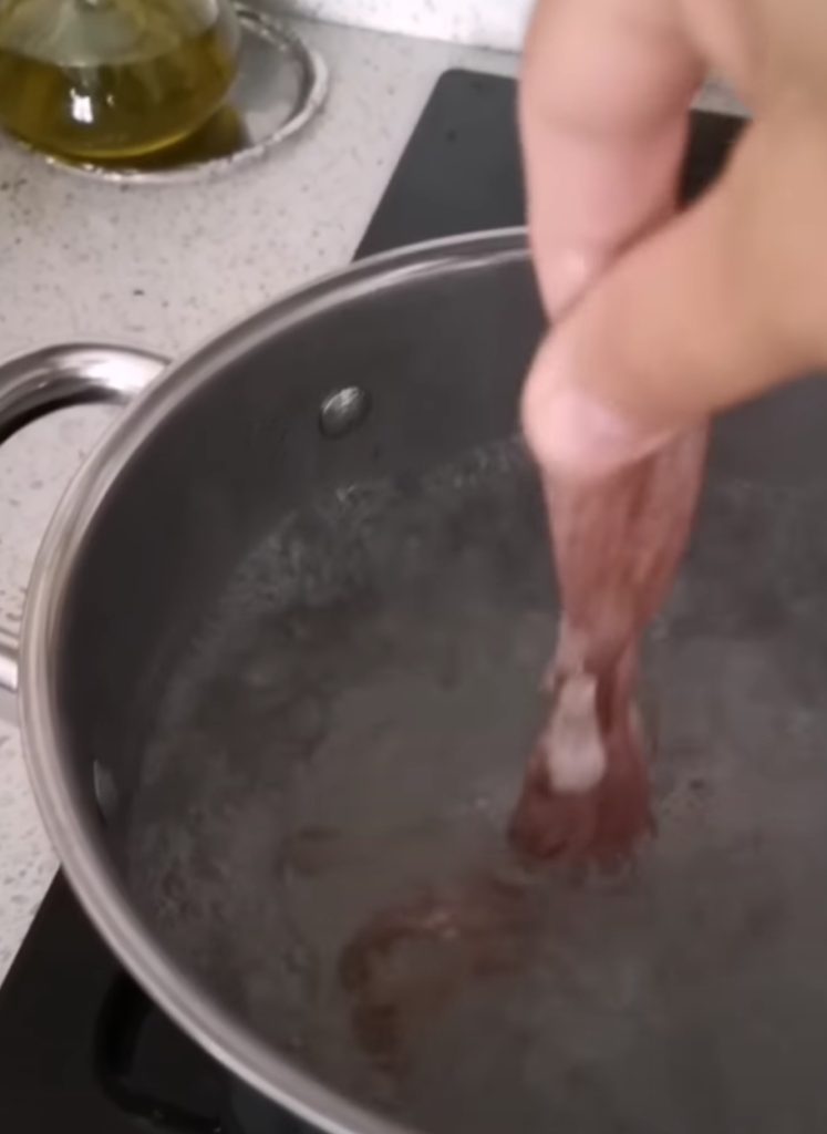 No primeiro passo peguei o polvo e o deixei ferver em água.
